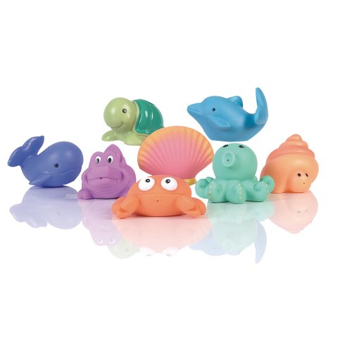 These sea creatures are so cute. They are just the right size and my 1 1/2 year old can sqeeze the soft plastic with no problem. They drain completely so no mold! Get these, they are great!