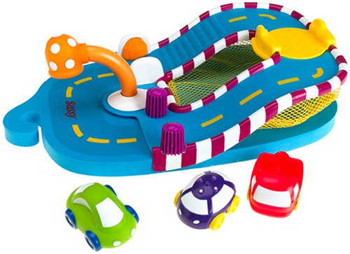Rub-a-dub-dub, three cars in the tub! Forget rubber duckies and bubbles�bath time gets really fun when there are vehicles to be washed. This car wash activity set will hold baby's attention long enough to turn her into a chubby raisin in the bath. An oval-shaped roadway features terry cloth sponges, bumps, squishy spinners, and a water-squirting nozzle. Bathers can scoop and strain water with the purple car, squirt water with the green car, and scoop and pour water with the red truck. A mesh pocket underneath provides a storage garage, and a convenient hook allows parents to hang the car wash over the shower nozzle when not in use. There's even a removable car ferry, so babies can float cars from one end of the tub to the next. So cute! A list of interesting and age-appropriate activities are provided, in case baby's not already having enough educational fun on her own! Made of soft, sturdy, mildew-resistant foam. For babies nine months and older. --Emilie Coulter