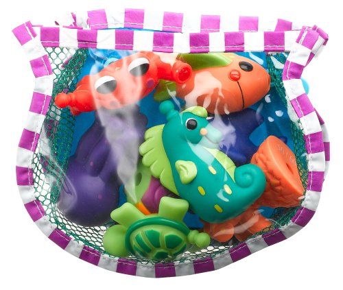 The Snap and Squirt Sea Creatures inspire baby's imagination by encouraging a variety of bath activities. Help baby snap the characters together to form a circle or chain. Show baby how to squeeze the characters to fill them with water for squirting fun. The fishbowl-shaped organizer is sure to make after-bath pick-up fun. Two large suction cups allow fishbowl to be attached to bathroom wall to allow squirters to drip dry.
