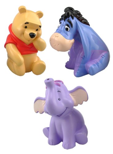 Pooh and pals take to the tub with this set of colorful squishy squirters. Set of three Pooh-themed toys comes in a plastic carry bag for easy clean-up. Each measures approximately 2.5 tall.