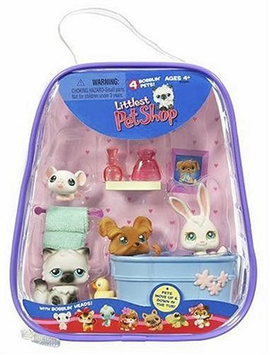 Tiny, cute, and born to bobble, the animals in this bathtime playset are ready for grooming after a day of play and fun. Part of the Littlest Pet line, the set includes a mouse, a rabbit, a cat, and a puppy, all with oversized bobblin' heads and adorable features. The pets take turns getting fresh and clean in the included bathtub, which has a rocking surface controlled by a little duck-shaped lever. Each animal has a hidden foot magnet that holds the body steady while the tub water rocks and the head bobbles. (The design makes these Pets interchangeable with other Littlest Pet magnetized playsets.) Little plastic bottles provide pretend shampoo and a towel does the drying. Designed for children age 4 and older, the set comes in a plastic carrying tote. --Emily Bedard
