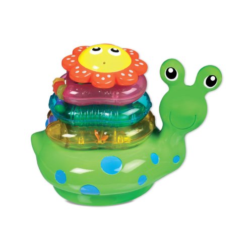 Let our friendly green snail keep your baby busy as a bee during his bath. It has 3 stackable and sortable rings with an engaging interactive toy inside. The smiley snail sails upright in the water so rings won't tip over. The flower even doubles as a squirt toy so mom, watch out for your little squirt! The Snail Stacker is sure to bring more fun to tub time, every time! Stacking by size teaches hand/eye coordination Ideal for kids 9+ months
