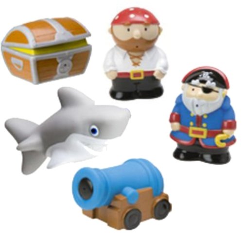 Sail the high seas right in your own bathtub! This rub-a-dub set includes two water-squirting pirates, water-squirting shark, water-squirting cannon and water-squirting treasure chest. Packaged in a reusable mesh bag for storage and drying. Squirters measure approximately 3 tall.
