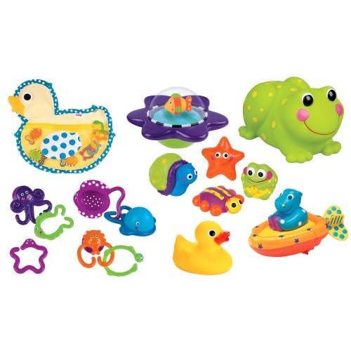 Sassy baby bath gift set is the ideal grouping of bath items for baby. This turns bath time into playtime with these great interactive toys. It’s made of child safe plastic. This includes a four piece squirter set and a floating bobber. It comes with a counting fish and net, fishing links and a frog tub toy bag. This is ideal for ages of 6 and above.