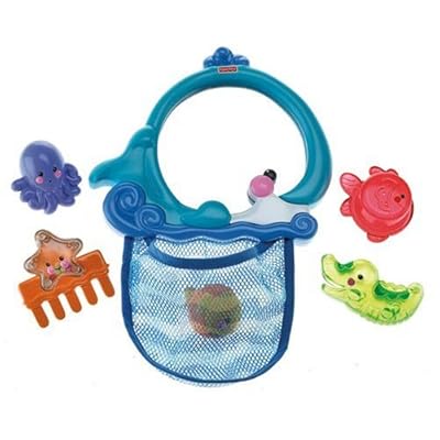 This is a mirror for bath time play that suctions to the side of the tub. It is characterized as a whale and comes with five fun toys. The toys include an octopus squirter, a fish squirter, a fish strainer, a starfish comb with rattle beads and an alligator pour toy. A net holds the pieces in one place and allows for easy drainage.