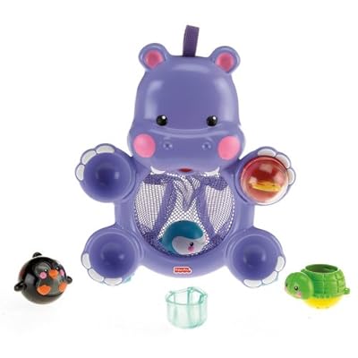 This bathtub toy has four fun activities for baby and offers easy cleanup and storage for mom. The toy is in the shape of a hippo with a net belly. Each of the hippo's hands holds a different toy. There's a flutter ball, a penguin with rattle beads, a turtle strainer and a whale squirter. When bath time is done, mom can store the four toys in the net belly, and the hippo can hang from the shower head or water spout by a webbed loop. This will allow the hippo and the toys to drip dry.