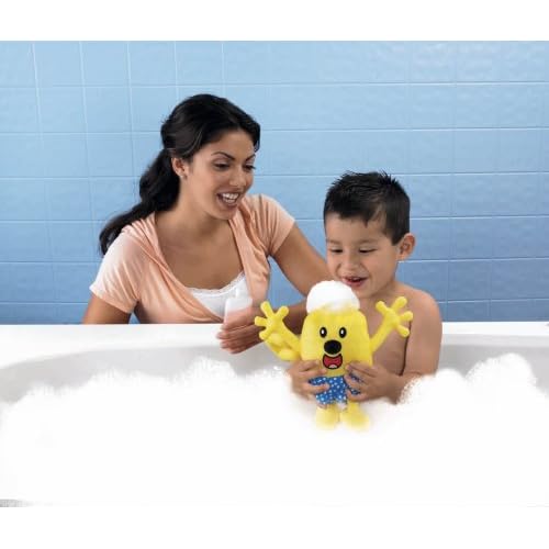 Soft Wubbzy bath toy. Wubbzy wears blue polka-dot swim trunks. Pour shampoo on Wubbzy's head and press his stomach to create a bubbly foam wig on his head! The more you squeeze, the bigger the bubble wig will become.