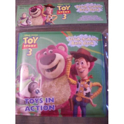oy Tale 3 Toys in Action (Scrub-bubble Bath Book). Includes 1 soft, stain-resistant book for infants and toddlers. Kids will acquire tons of bathtub fun with Woody, Buzz, and the rest of their friends in this Scrub-bubble Bath Book! Ages 6 months +. Book measures 5.5" x 5".